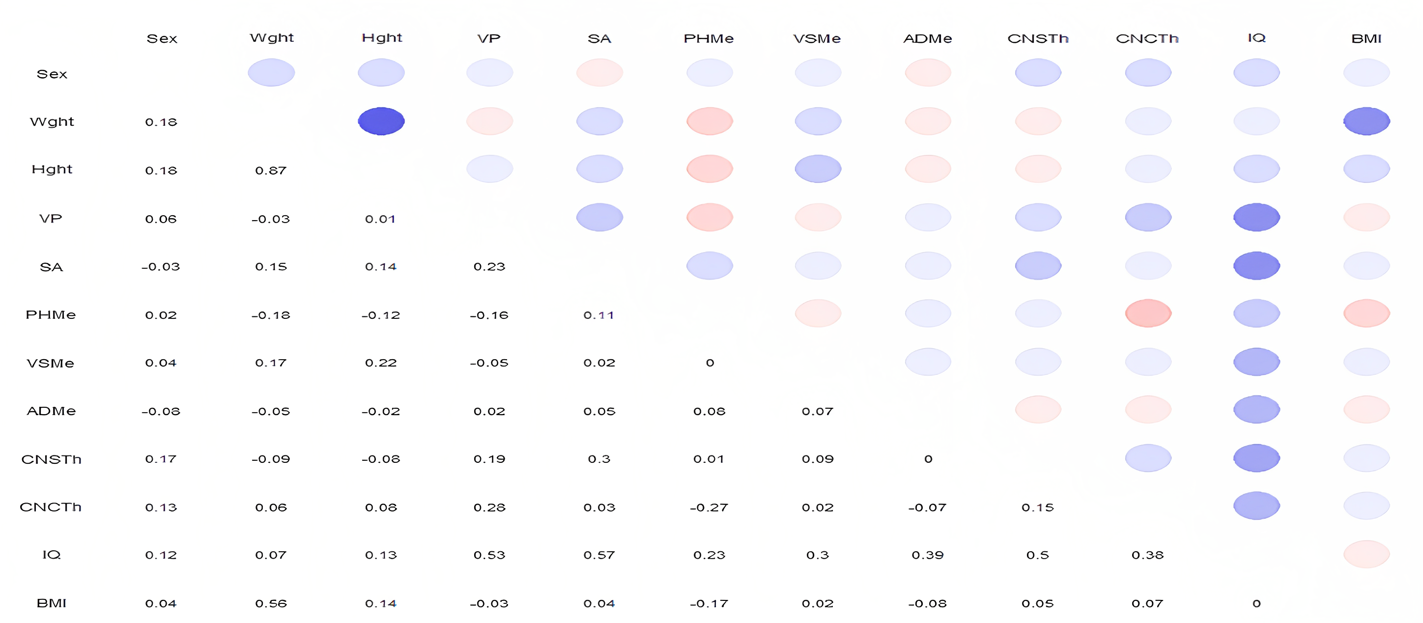 Figure 1 Spearman’s correlation matrix for pairwise correlations between anthropometric and cognitive measurements. Blue circles indicate positive correlations; red circles indicate negative correlations. BMI=Body Mass Index; Wght=weight; Hght=height; VP=visual processing; SA=selective attention; PHMe=phonological memory; VSMe=visual memory; ADMe=auditory memory; CNSTh=constructive thinking; CNCTh=conceptual thinking; IQ=intelligence quotient.