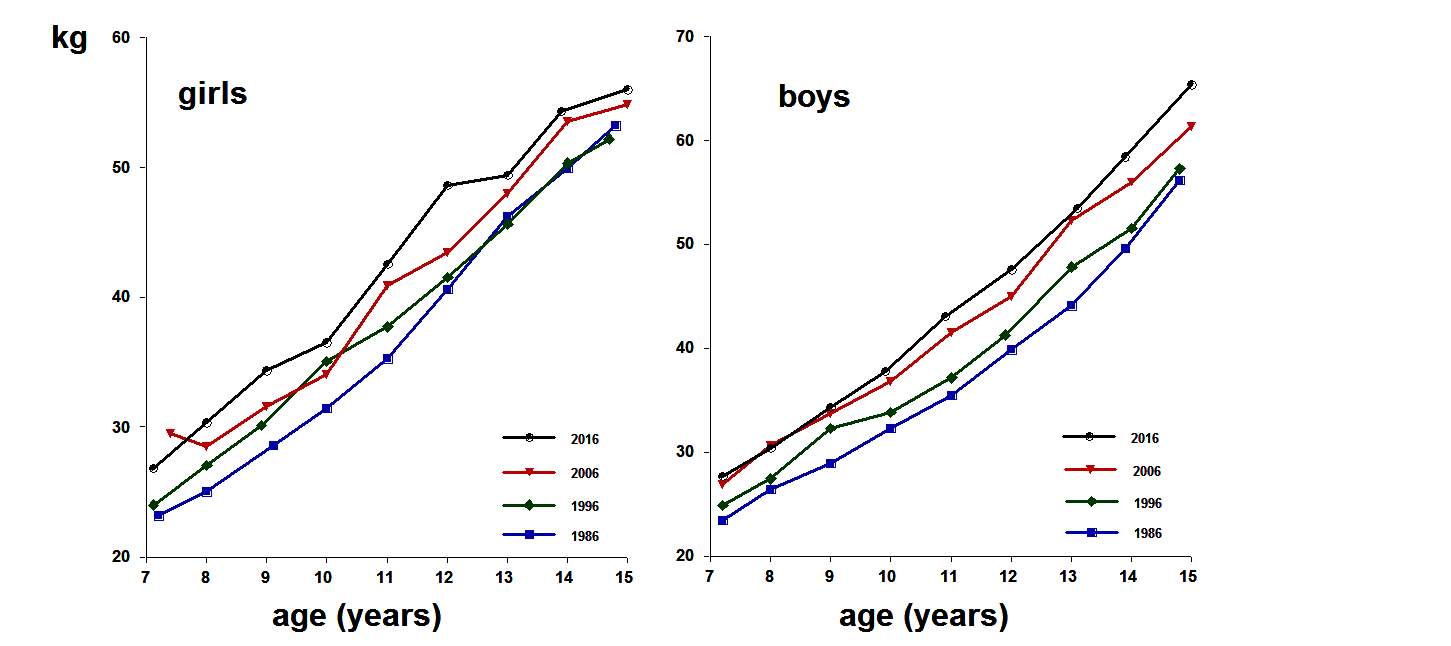 Sylwia Bartowiak presented secular change in height and weight of rural school children 7–15 years of age in the Greater Poland Voivodeship (West-central Poland) between 1986 and 2016. Data were obtained from growth surveys (height, weight, physical fitness) in ten rural communities conducted in 1986, 1996, 2006 and 2016, with 1417 boys and 1326 girls in 1986; 979 boys and 947 girls in 1996; 871 boys and 843 girls in 2006; and 1189 boys and 1105 girls in 2016. The sample was partitioned into three age groups (1) 7-9 years – middle childhood in both sexes; (2) 10-12 years – transition into puberty and mid-puberty (most girls, many boys); and (3) 13-15 years – late adolescence (girls), interval of the growth spurt (boys). Sex-specific MANCOVA with age and age2 as covariates were used for comparisons in each of the three age groups; pairwise post hoc comparisons between specific pairs of surveys, adjusted for multiple comparisons (Bonferroni), were evaluated. Between 1986 and 2016, significant secular increases in height and weight were noted, but varied across the decades (Figures 1).