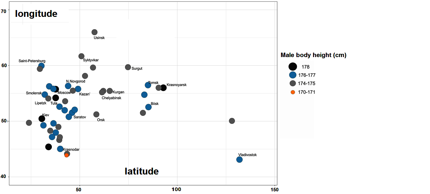 Figure 2 Lidia Lebedeva discussed geographical differences of body height between continents, macro regions, and different countries with particular emphasis on the Russian situation (Lebedeva 2019), based on an aggregated individual dataset of the Russia Longitudinal Monitoring Survey, Higher School of Economics (RLMS HSE) of the years 1994-2016, with 316,600 responses of 22-65 years old adult persons.